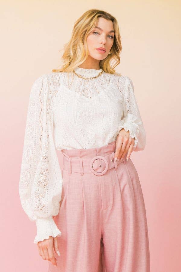 Final Sale‼️A lace top featuring high neckline with mini ruffled edge, long sleeve with smocked cuff, solid cami, relaxed body and back keyhole button closure Details Self: 95% Polyester 5% Spandex Lining 100% Polyester Size & Fit - Model is 5`8" And Wearing Size Small - Measurements Taken From Size Small - Approx Length: 22"